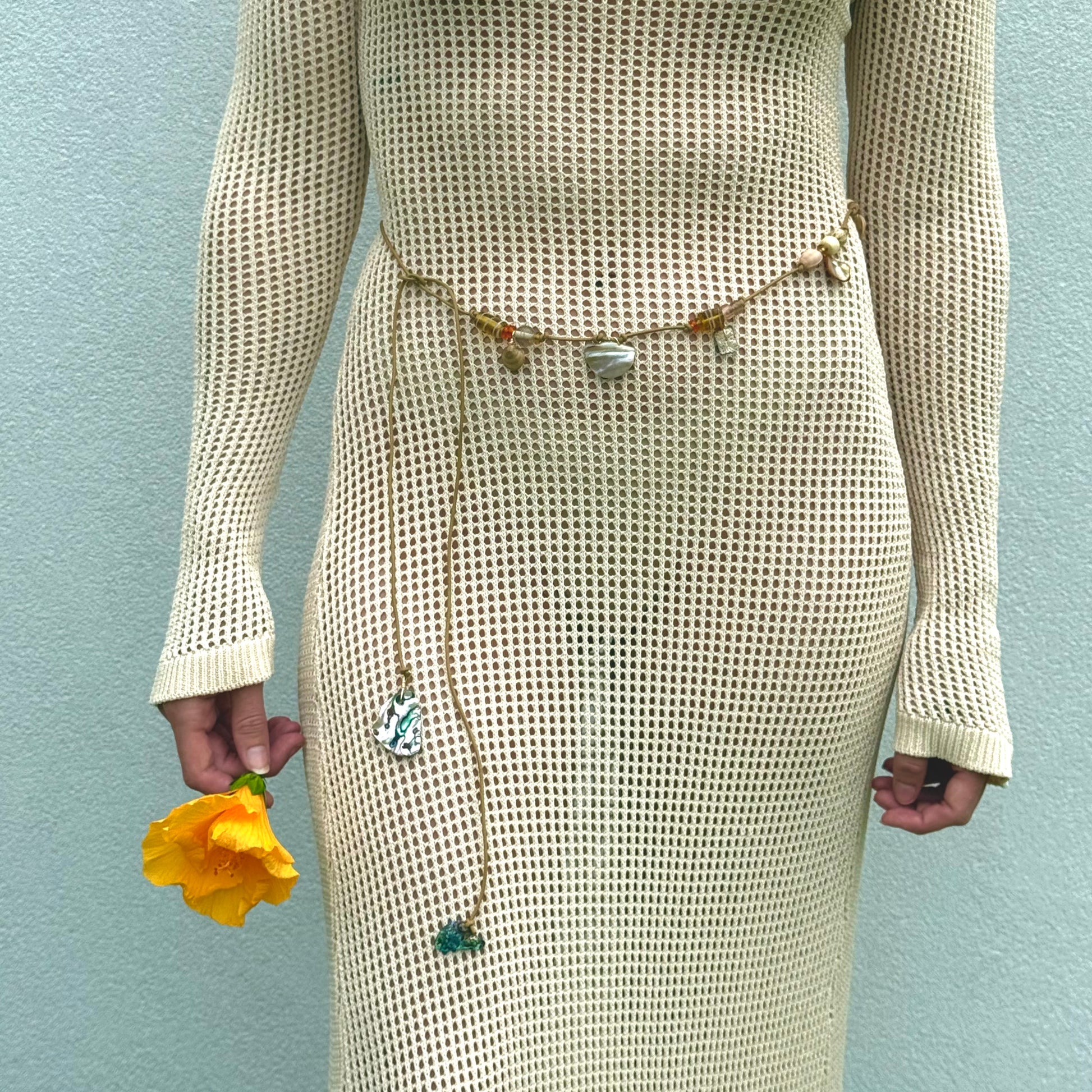 Crafted using premium beige leather and a selection of vintage glass, resin, porcelain , shell and bone beads. Shell beads are hand drilled and strung with gold plated wire.