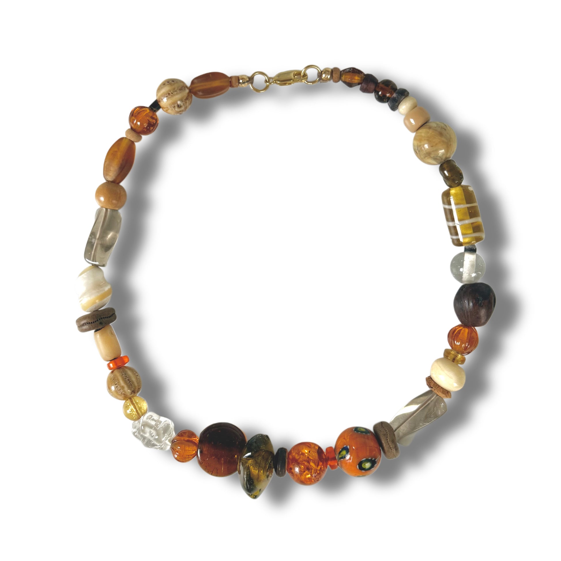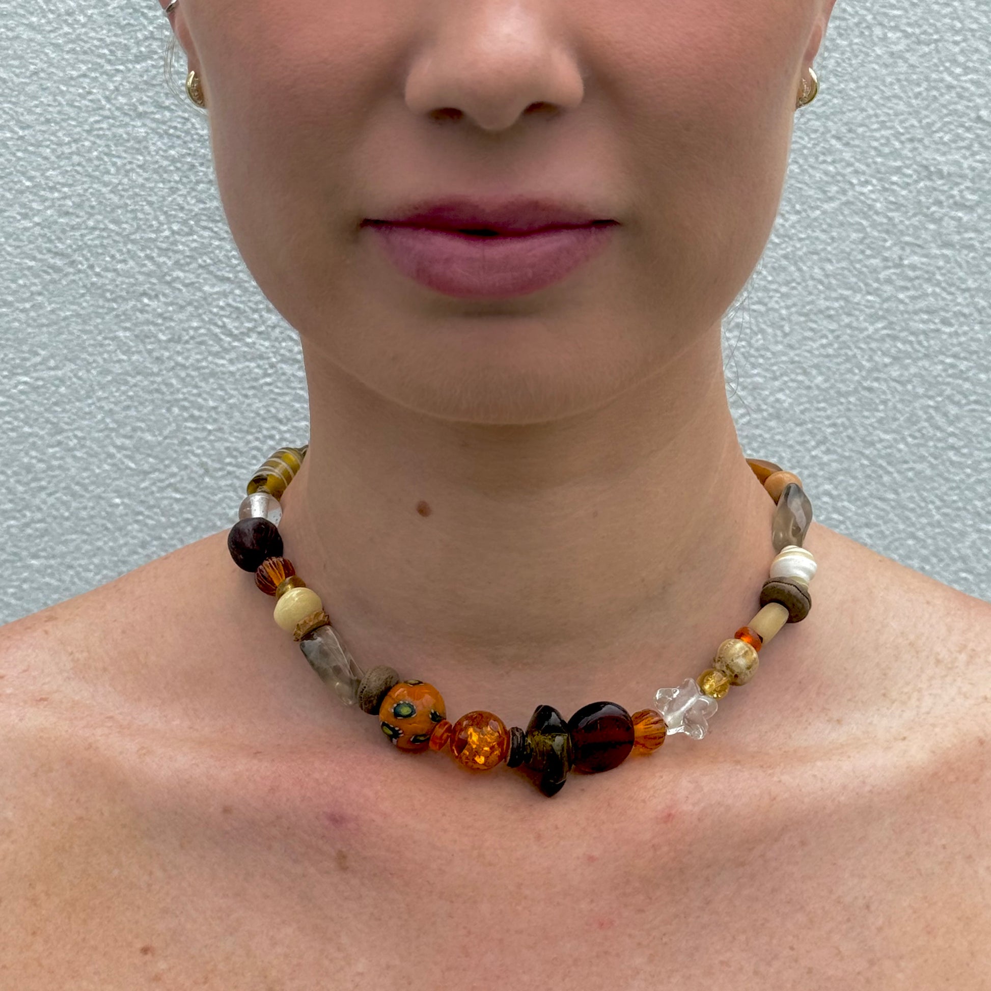Slowly, mindfully created statement choker necklace strung with a mix of reclaimed vintage glass, shell, amber, Hetian jade, resin, wood, bone, porcelain, hand painted clay, and lampwork glass beads.