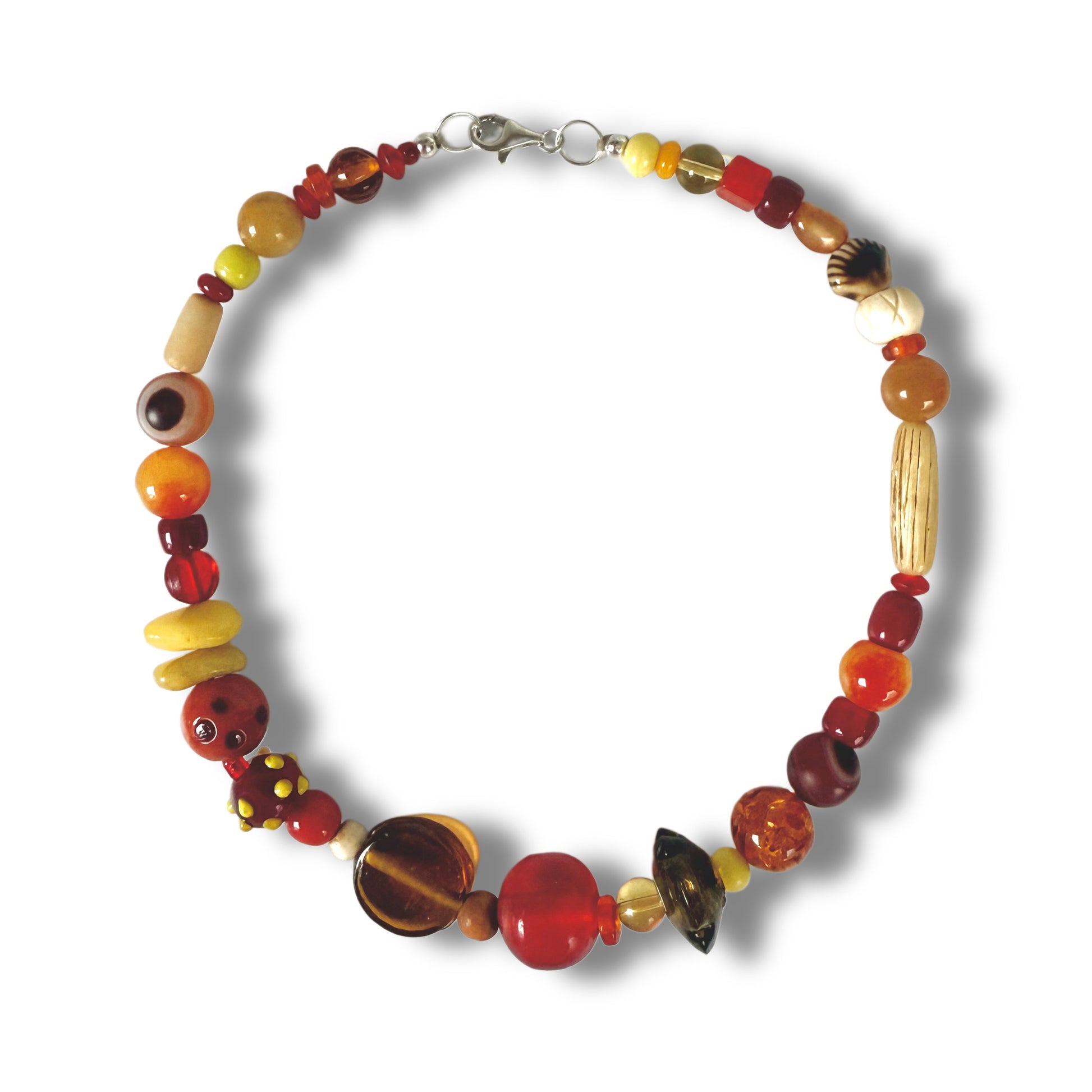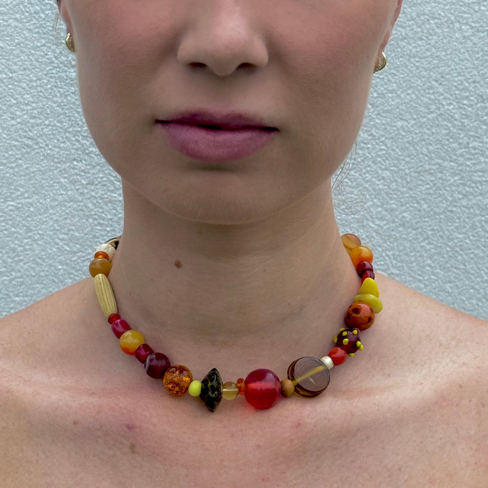 Slowly, mindfully created statement choker necklace strung with a mix of reclaimed vintage glass, resin, amber, Hetian jade, bone, and lampwork glass beads.