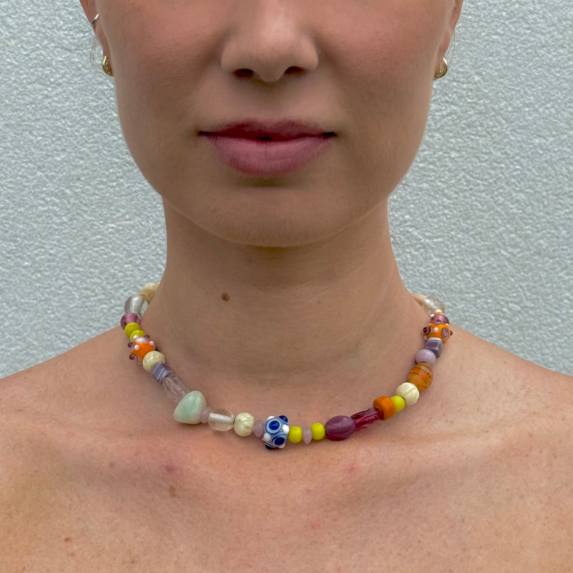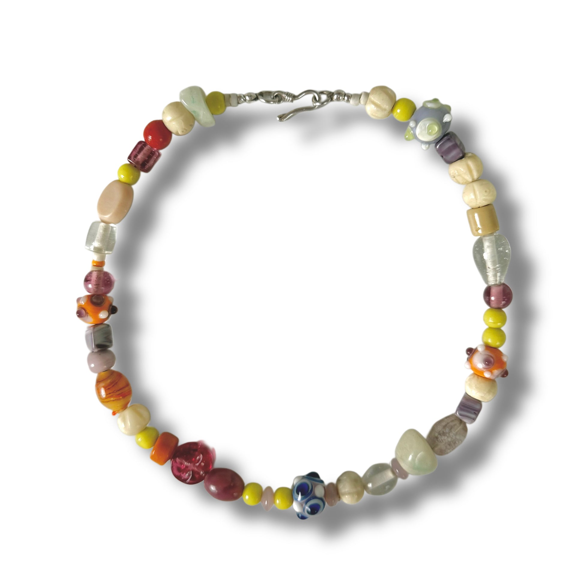 Slowly, mindfully created statement choker necklace strung with a mix of reclaimed vintage glass, hand carved bone, shell, and lampwork glass beads.