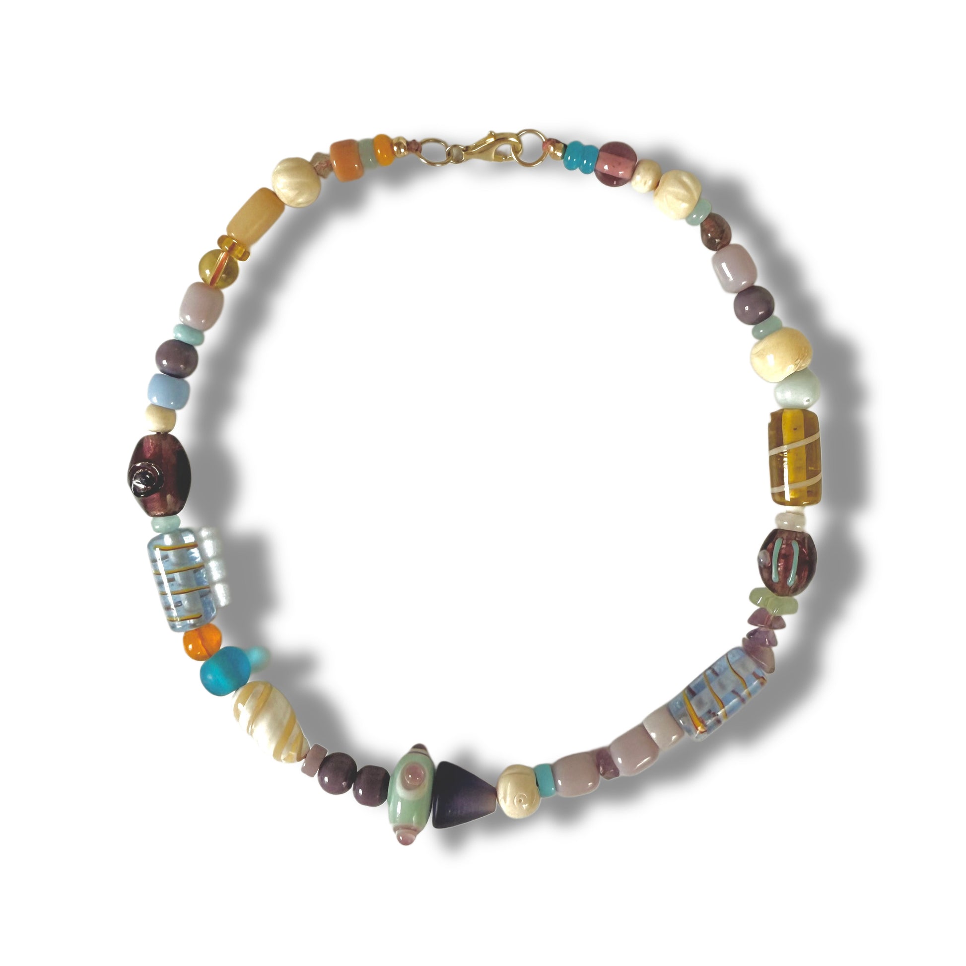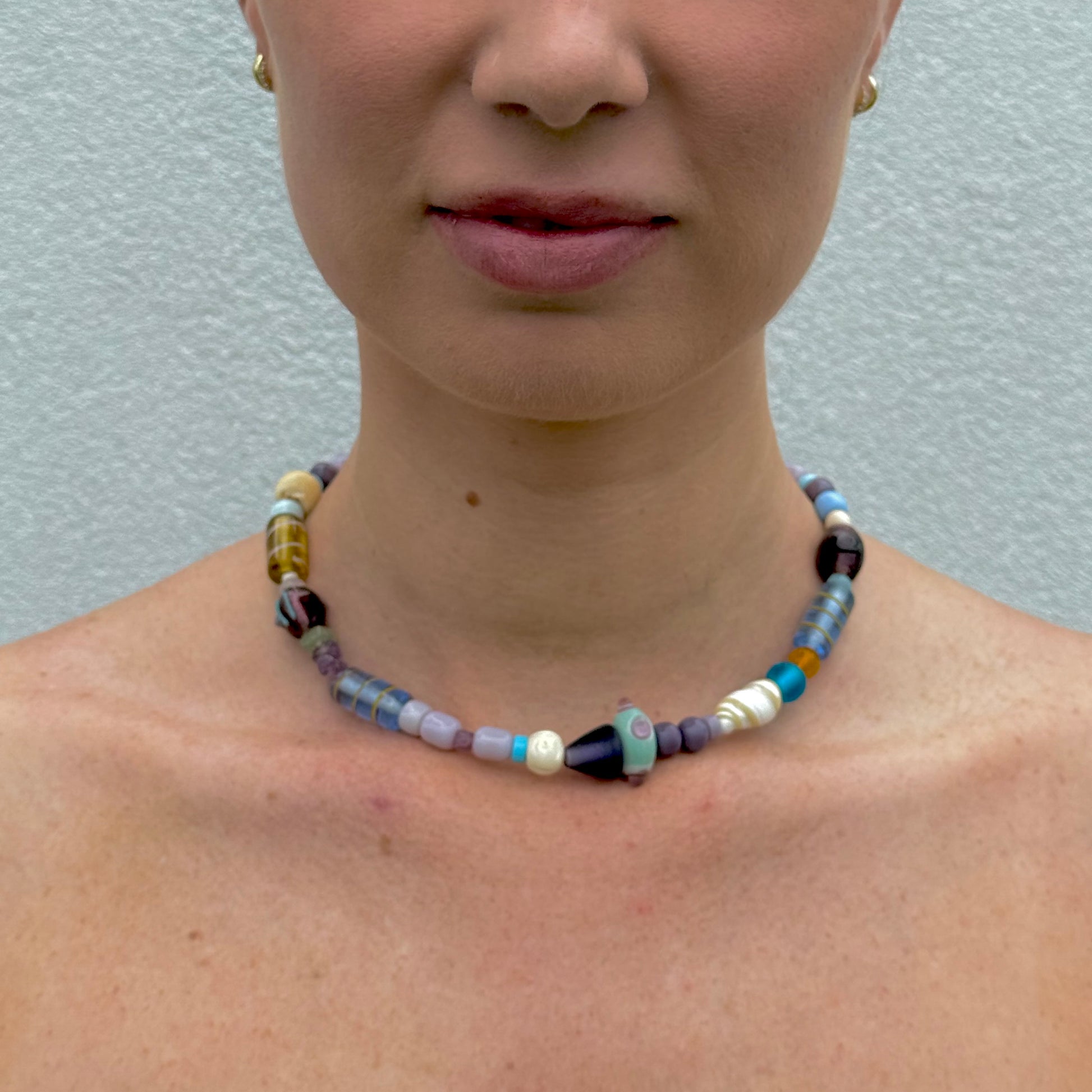 Slowly, mindfully created statement choker necklace strung with a mix of reclaimed vintage glass, shell, jade, amethyst, carved bone, and lamp-work glass beads.