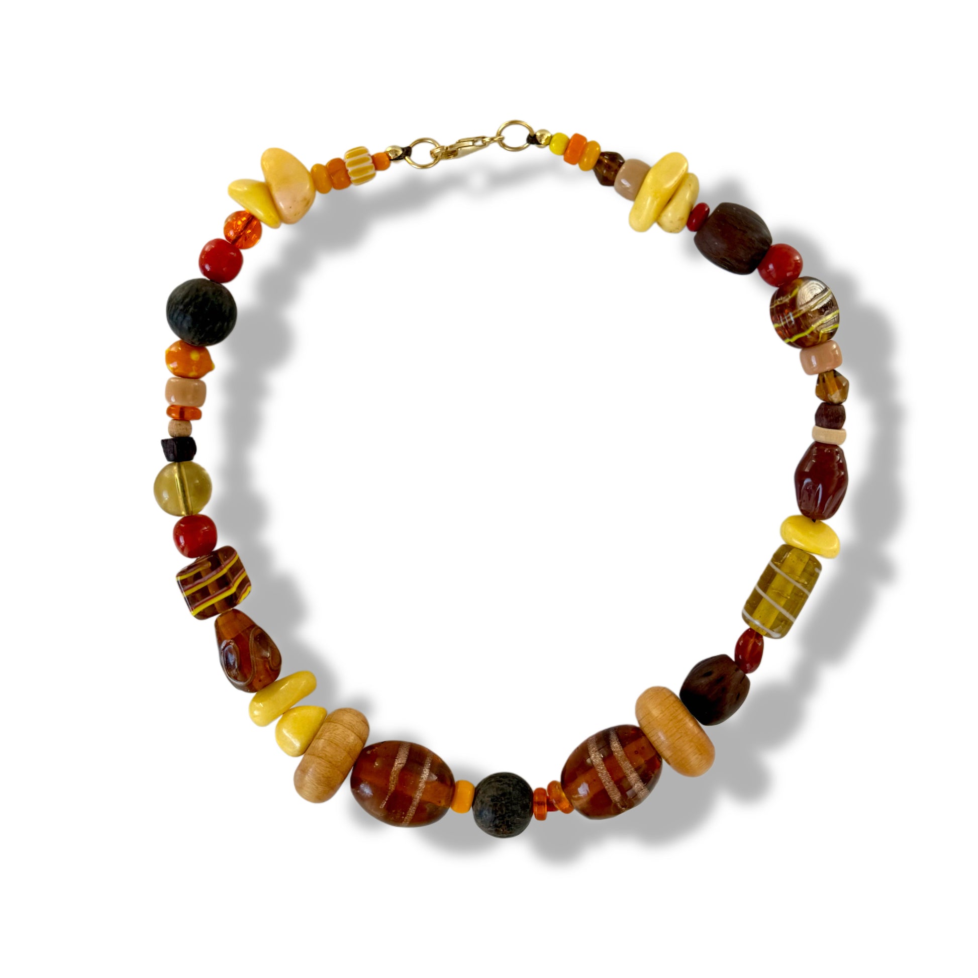 Slowly, mindfully created statement choker necklace strung with a mix of reclaimed vintage glass, agate, seed, bone, wood, and lampwork glass beads.